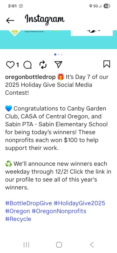 Starting on Dec 18th, we have joined forces with Oregon Bottle Drop to raise money for our nonprofit. BottleDrop Give makes it easy to fundraise, collecting and returning beverage containers to reach our fundraising goals.