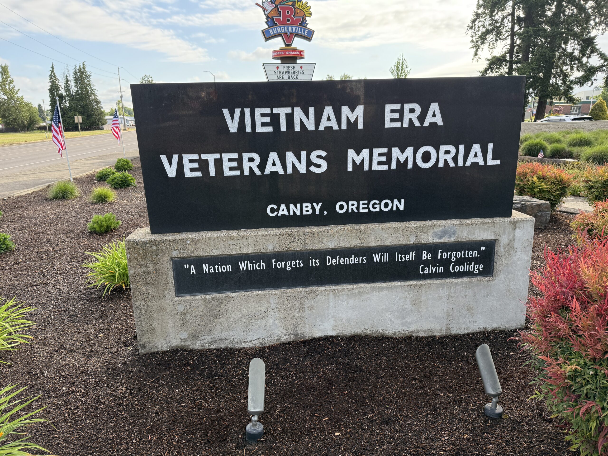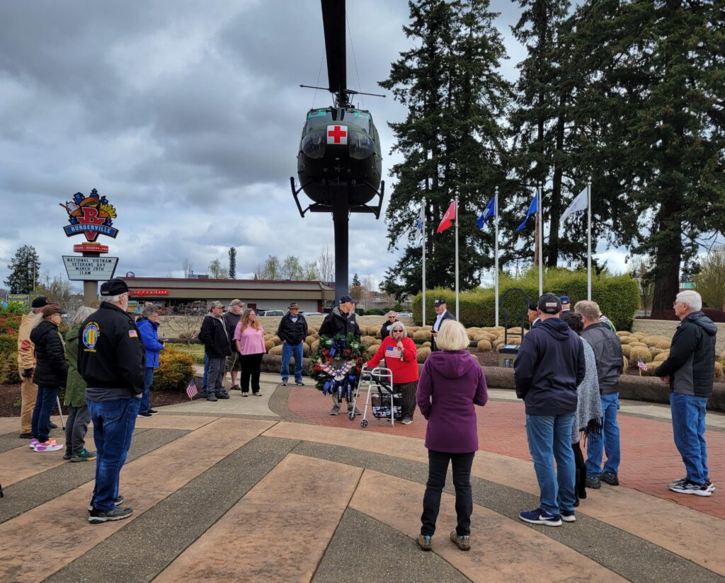 The Canby Garden Club supports the Vietnam Veterans Memorial with Wreath Dedications. One of our amazingly creative members created a wreath and her husband built a holder for the dedications. We maintain the wreath and put out the wreath when the local VFW Post honors veterans during their various Memorial Day events.